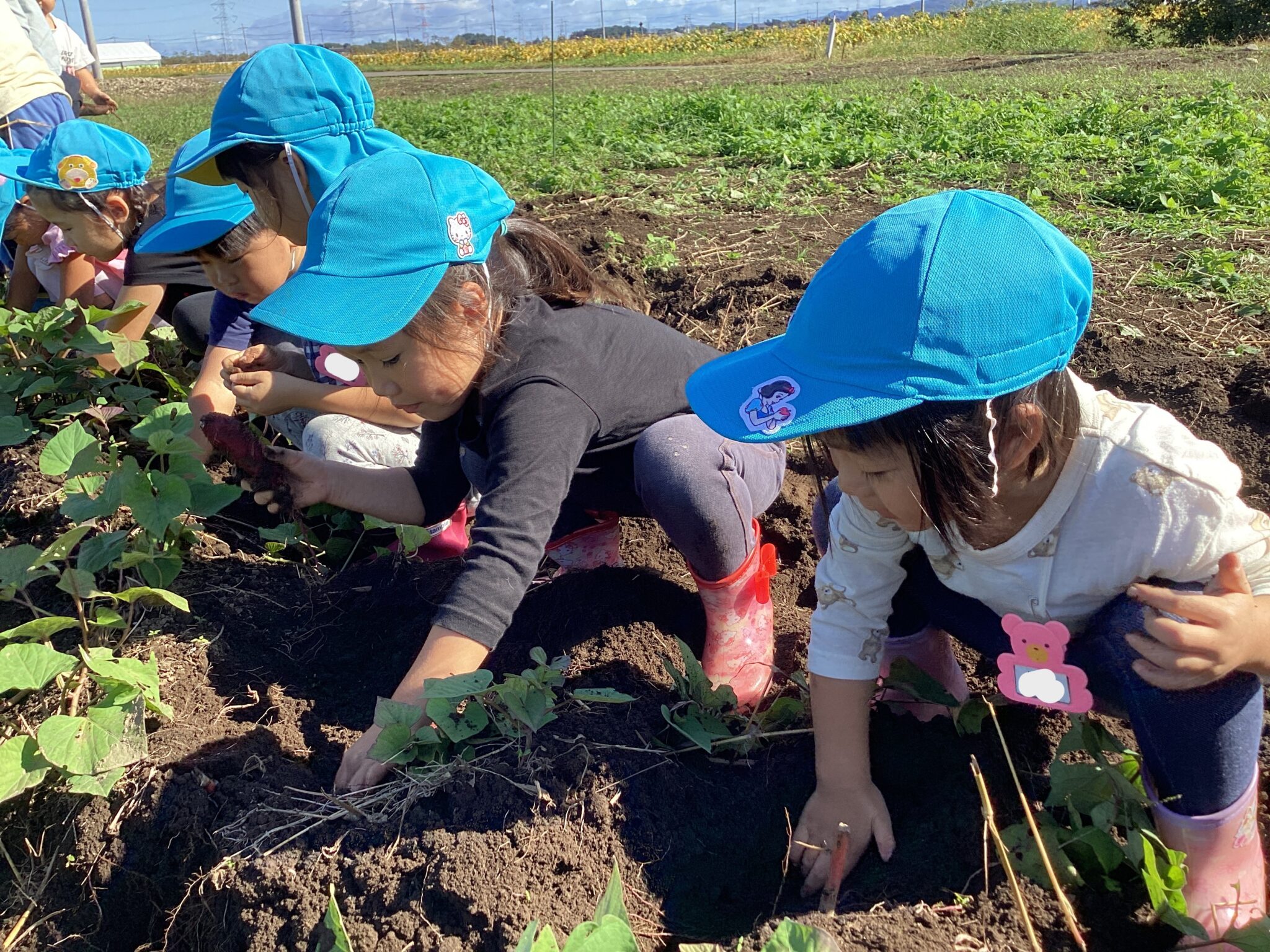 10月17日にお芋ほりに行きました♪朝からとってもお天気が良く子どもたちもウキウキと登園してきました!バスの中では「大きいおいも掘るぞー」「たくさんとれるかなー?」と楽しくお話をしていました。お芋畑に着くと、おじさんから掘り方を教えて頂き、スタート!!