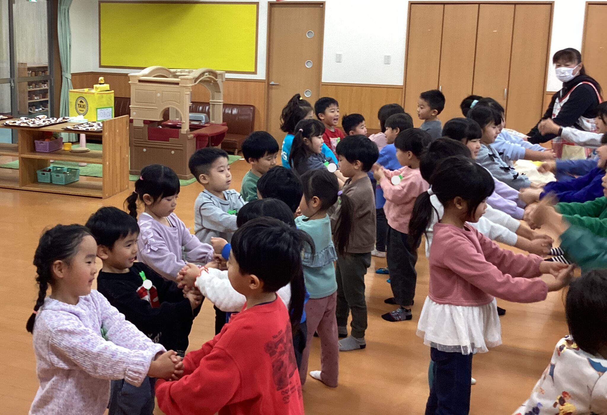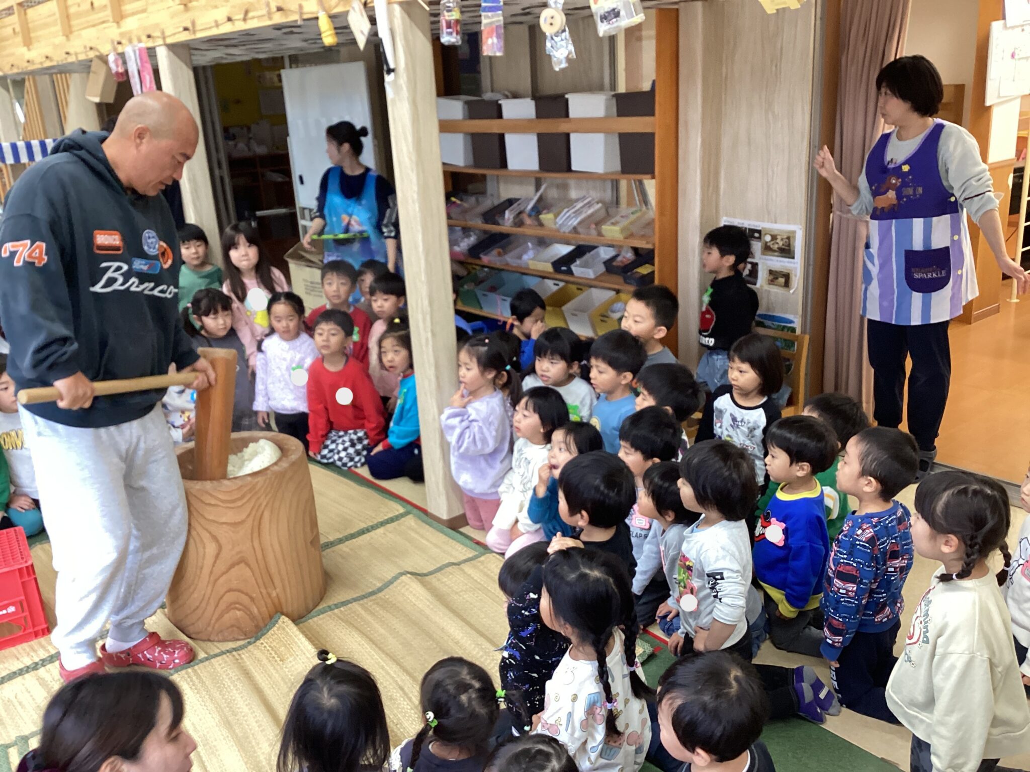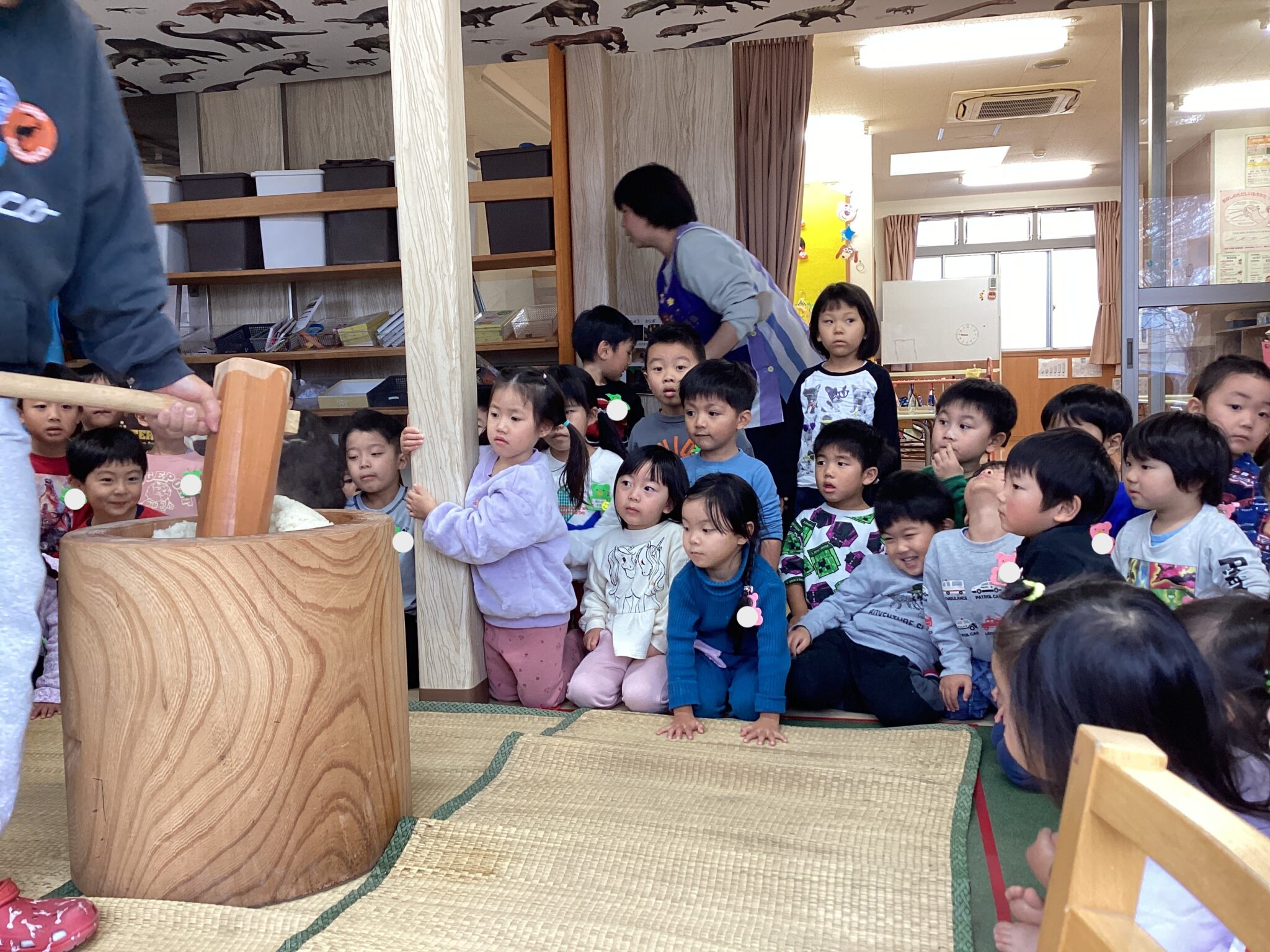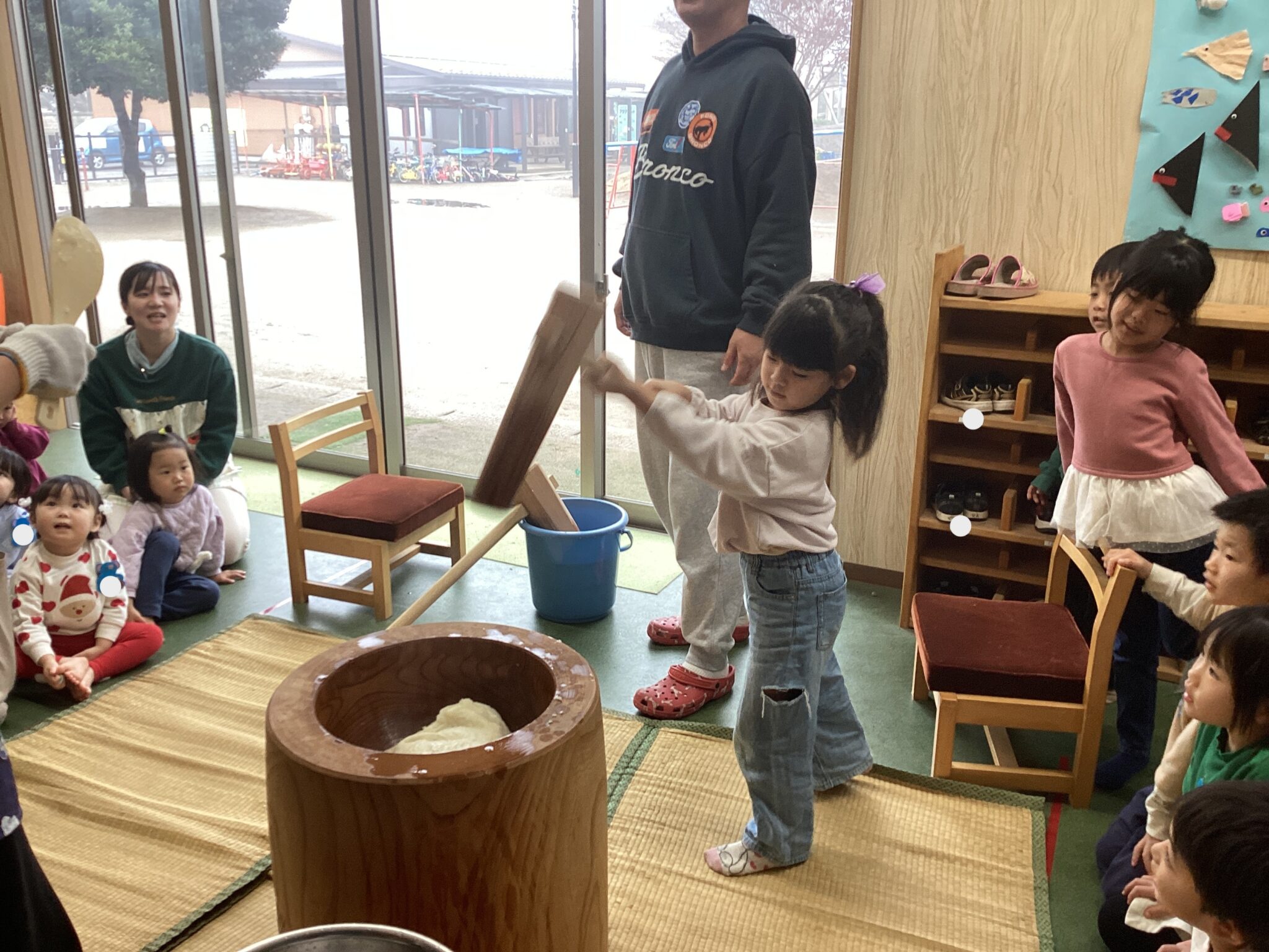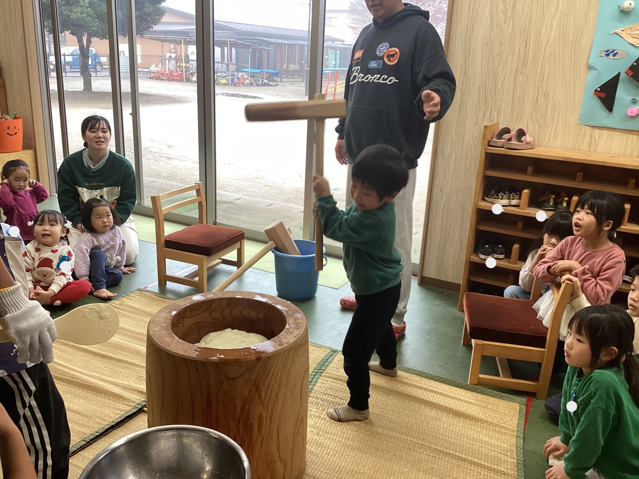 12月25日にもちつき会をしました。朝から少しずつもちつき会の準備をしている様子を見ていた子どもたちは、興味津々!大きな臼が用意されるとみんな驚いていました!
