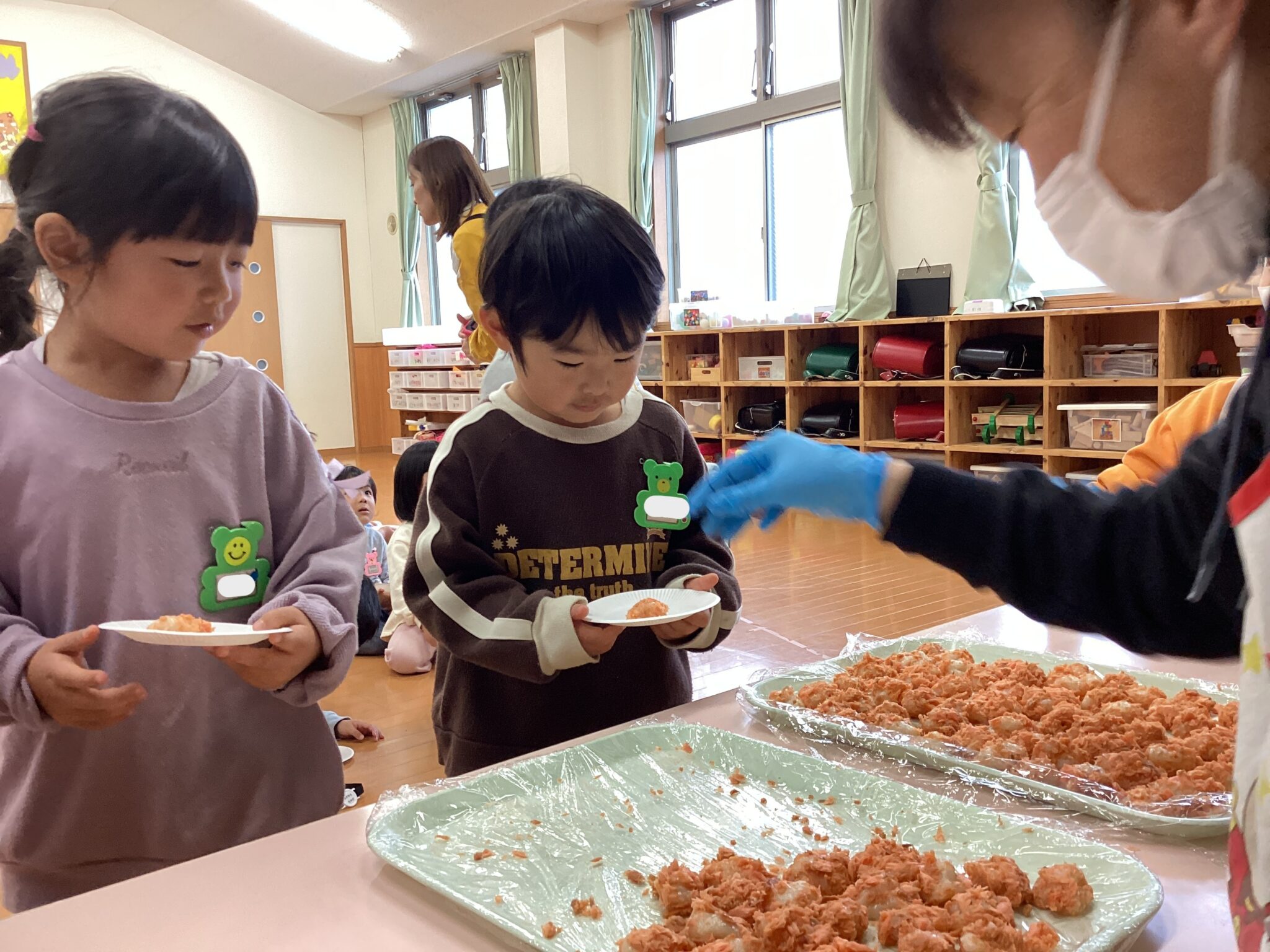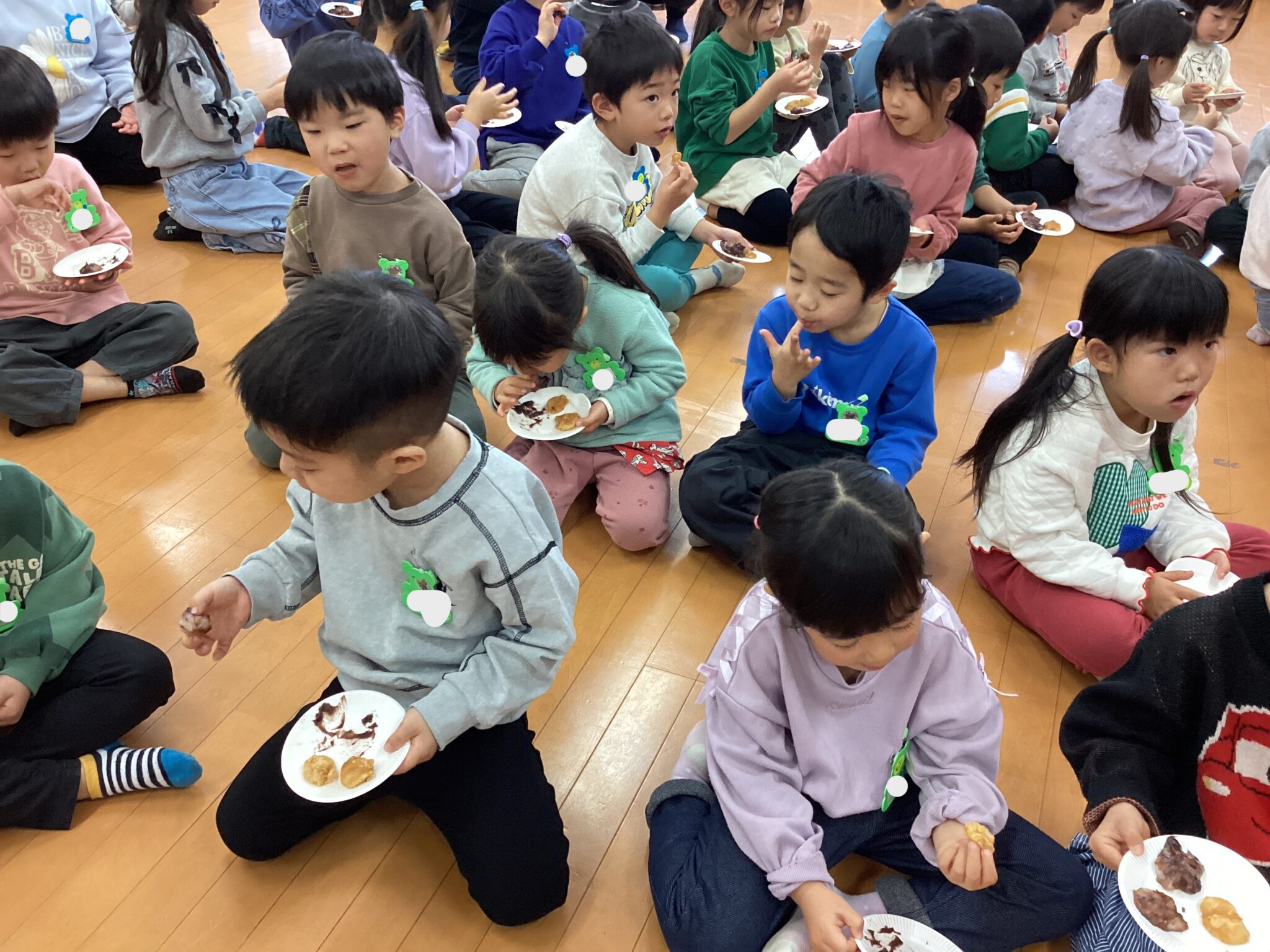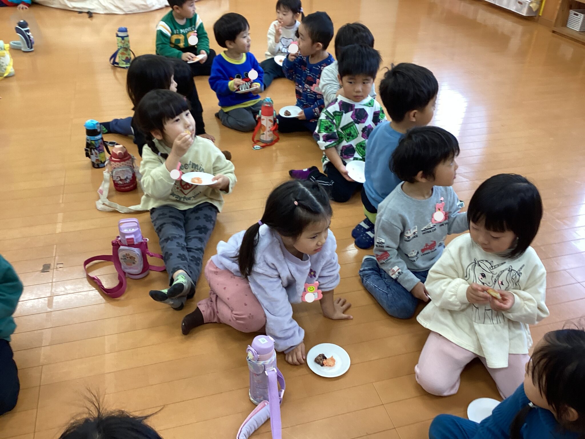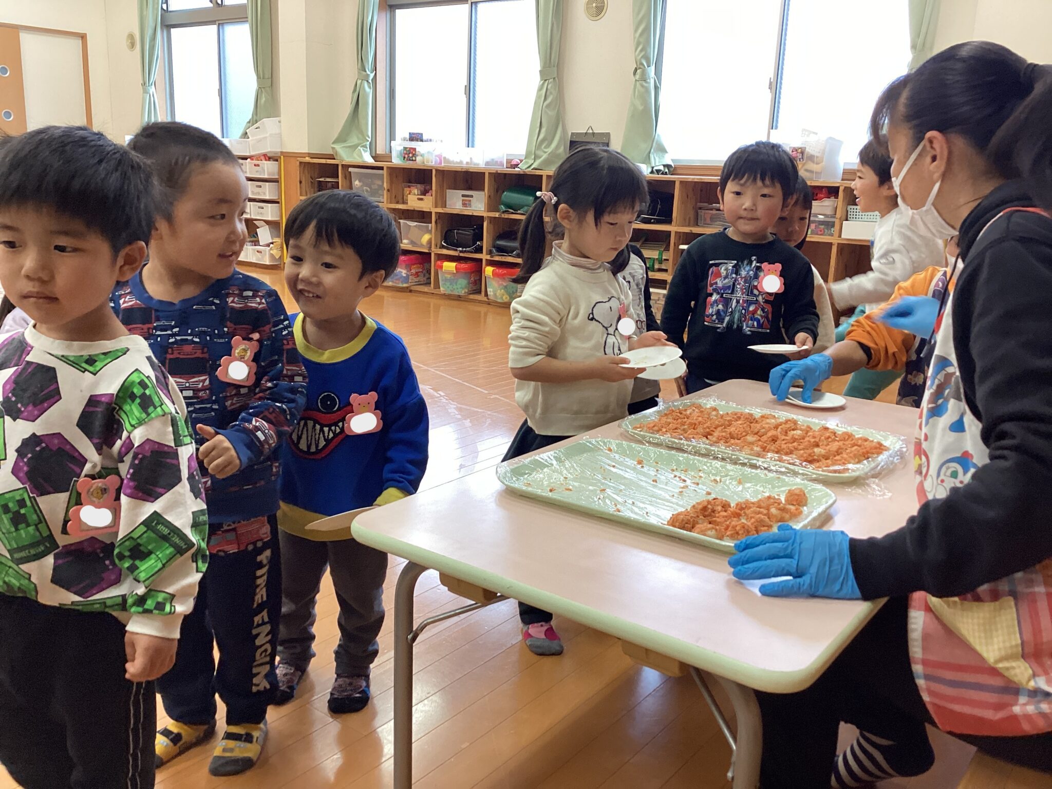 一回目のおやつでは、あんこときな粉を食べました♡「もちもちしてるー!」「おいしいねー!」とみんなが笑顔になりました!二回目のおやつは、なんと5歳児きりん組のお友だちが一生懸命大きな杵を使っておいしいおもちを作ってくれました!あんこときな粉とシャケもちを食べました♡甘いおもちやしょっぱいおもちをたくさん食べました☆